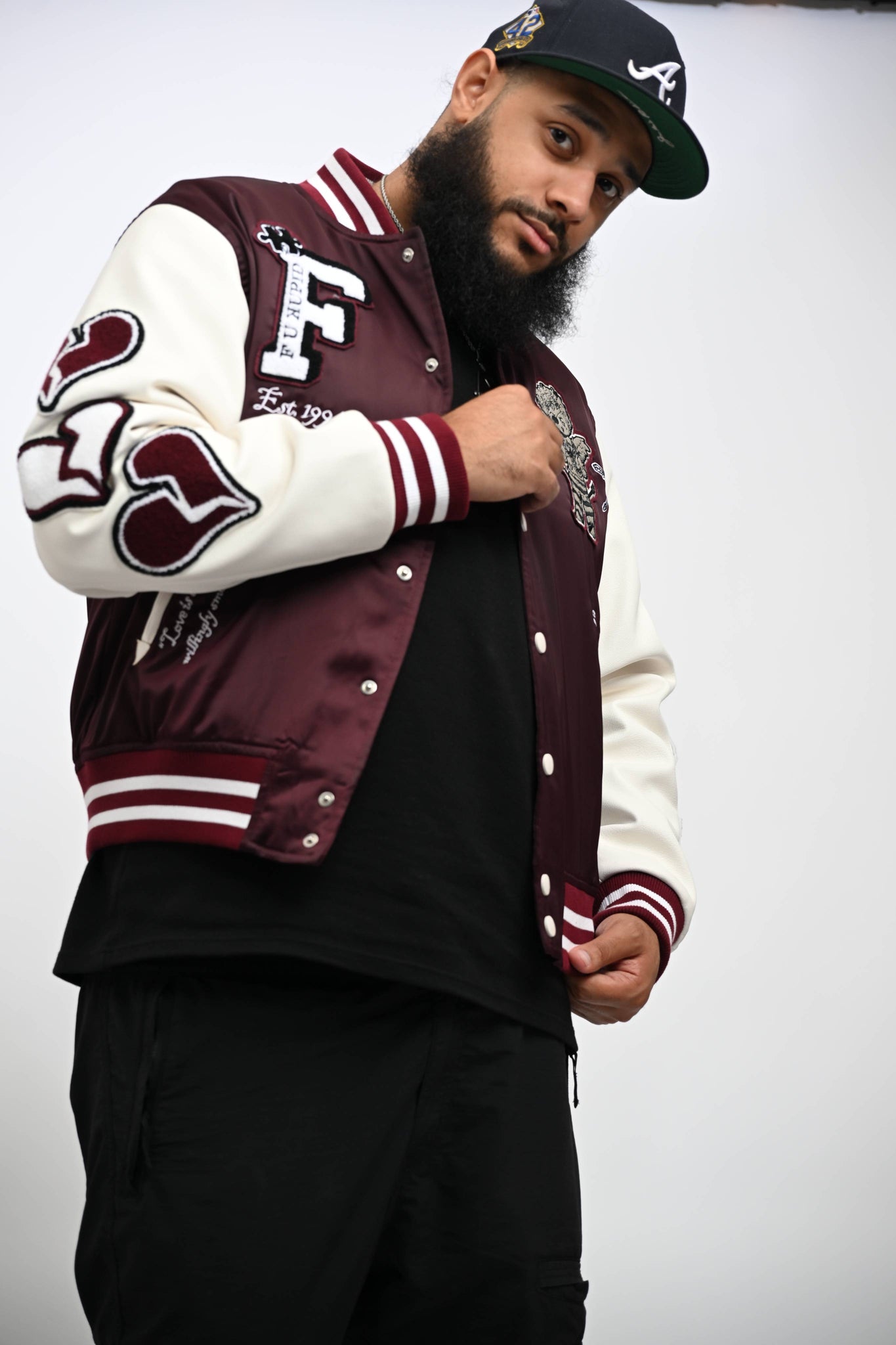 Embrace a bold statement of style and sophistication with the F U Kupid Black - Heartbreaker 41 Letterman Jacket in a rich Merlot Mystique. Crafted from sumptuous satin, this jacket seamlessly blends luxury with an edgy aesthetic, while its premium leather sleeves add a touch of refinement worthy of any curated collection.