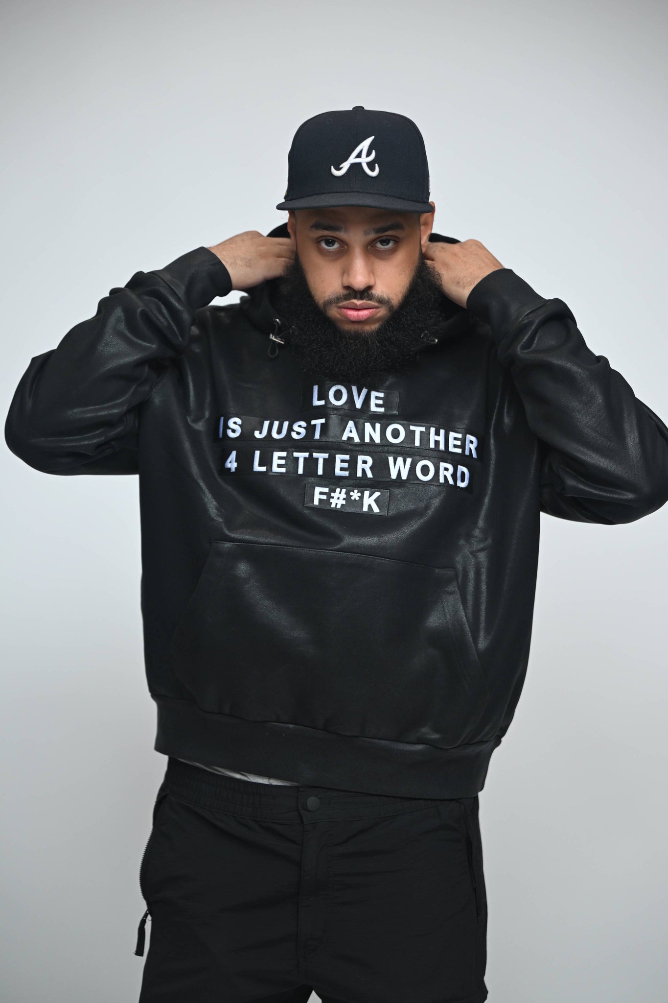 Step into a realm where contemporary artistry meets extraordinary craftsmanship with the F U KUPID BLACK - LOVE IS Just Another 4 Letter Word Waxed Hoodie. Designed in a luxurious waxed finish, this drop-shoulder hoodie is your ultimate statement piece, ensuring you make a lasting impression at any gathering.